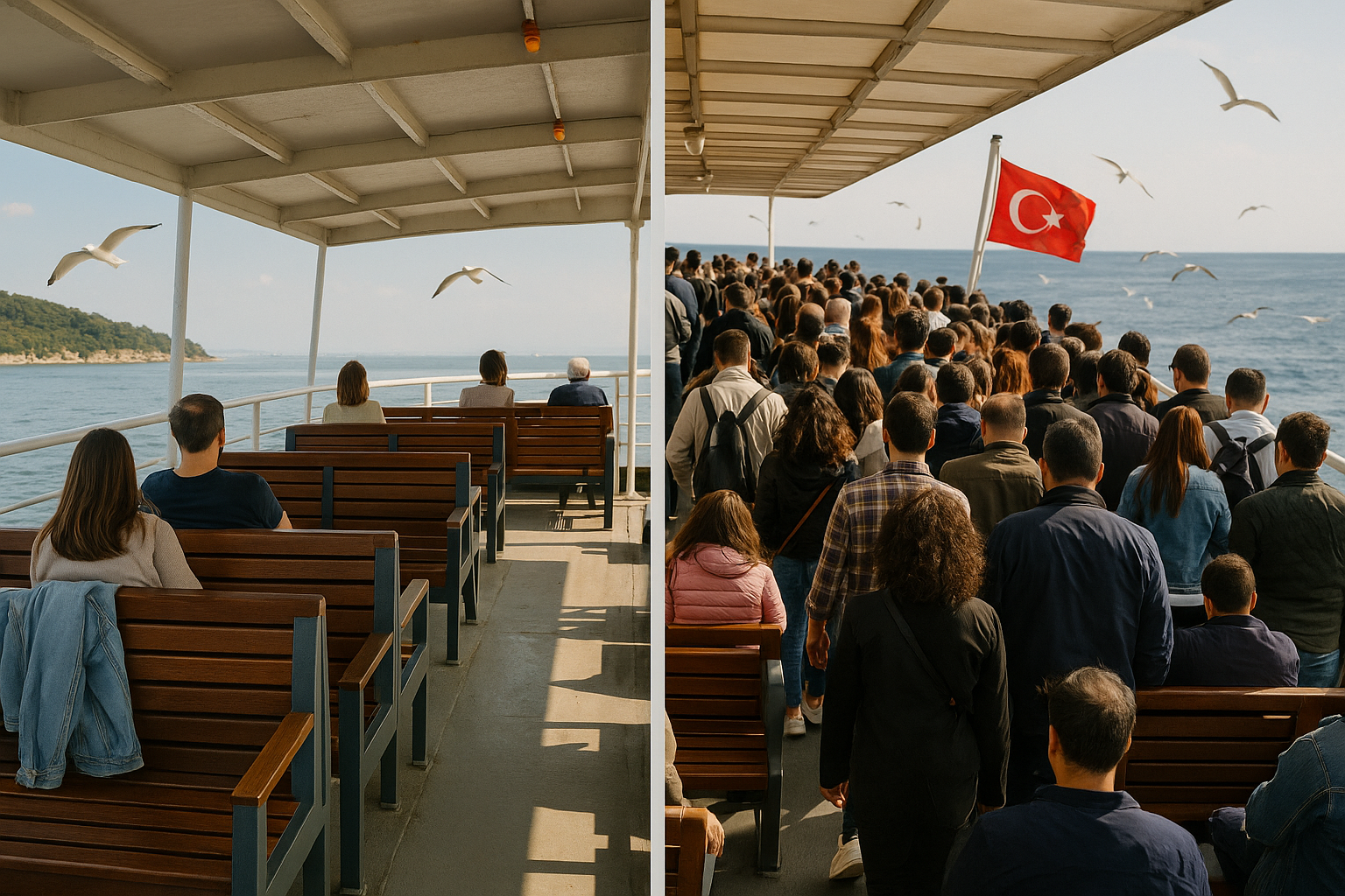 Vapur seferleri daha sık olmasına rağmen, özellikle sabah gidiş ve akşam dönüş saatleri inanılmaz derecede yoğundur. Vapura binebilmek için planladığınız saatten en az 30-40 dakika önce iskelede olmanız gerekebilir. Fiyatlar ise genellikle standart tarifededir ve hafta içine göre daha yüksek olabilir. Bisiklet kiralama gibi hizmetlerde pazarlık yapma imkanınız neredeyse sıfırdır.